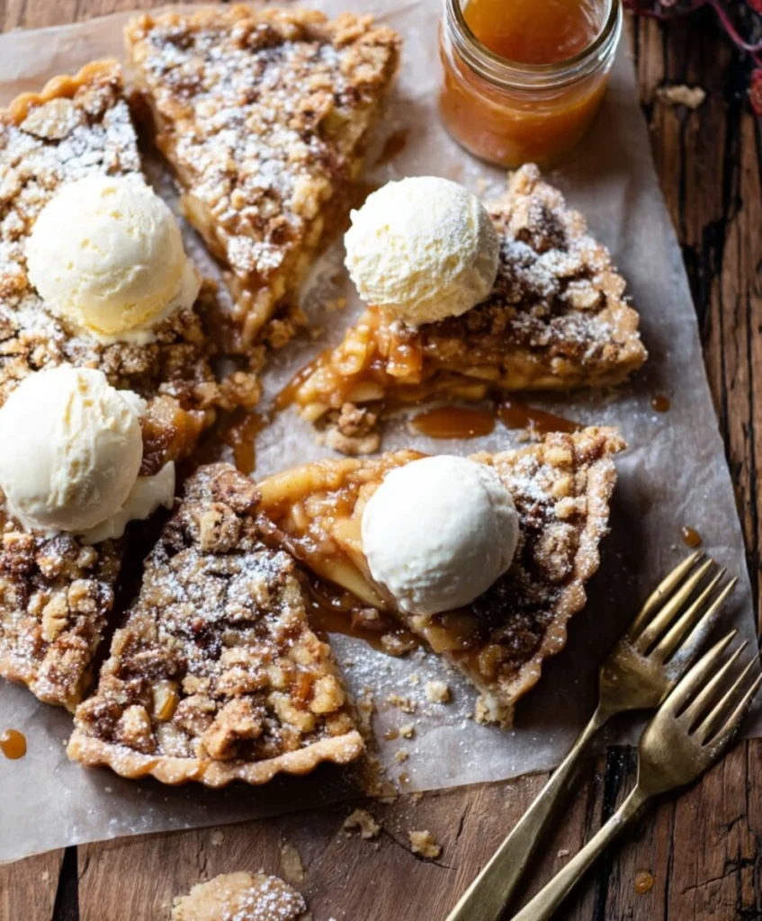 - The flavors are layered: sweet caramel, tart apples, nutty streusel, and buttery crust.