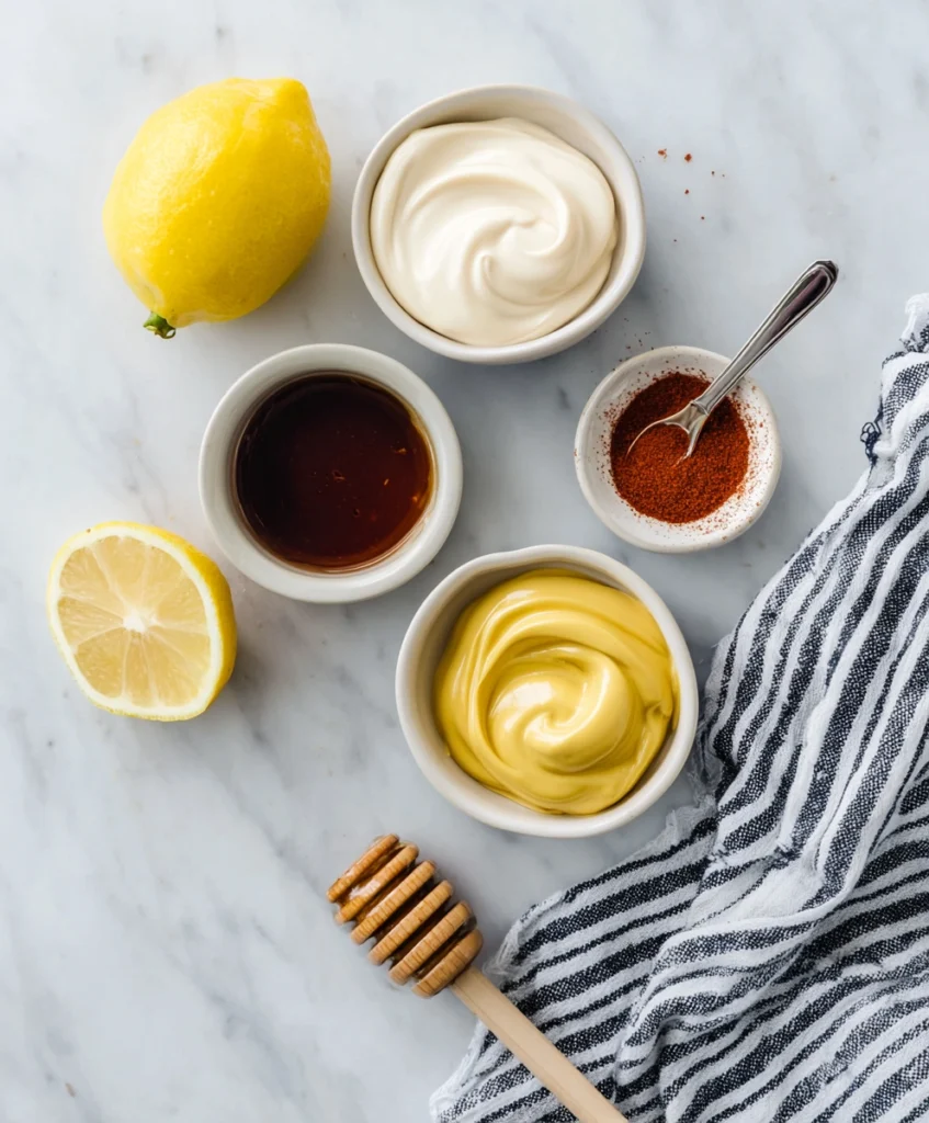 - In a small bowl, whisk together the mayonnaise, Dijon mustard, yellow mustard, honey, lemon juice, and cayenne until smooth and creamy.